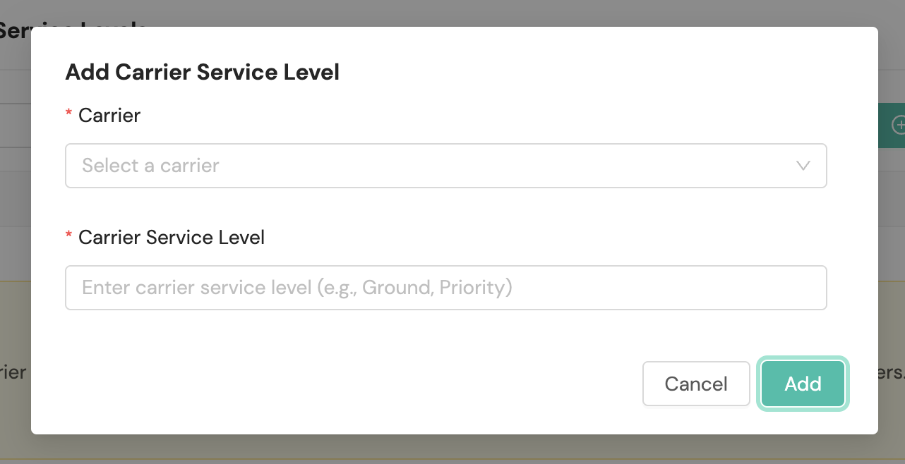 Selecting the + Add Carrier Service Level button prompts you to select the carrier from a dropdown menu and to define its service level.