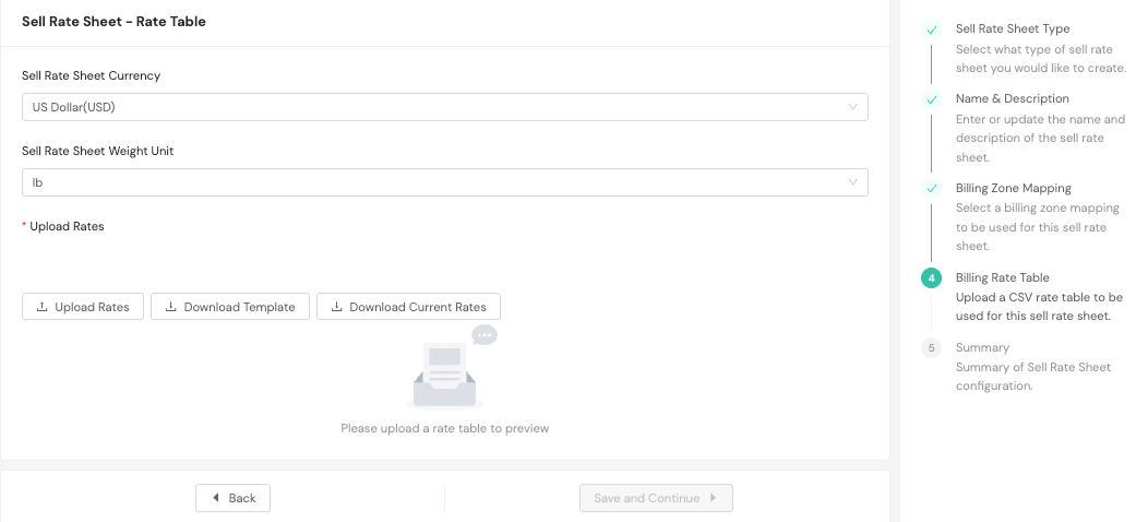 Once you have established zone mapping, you'll select the sell ratesheet currency and weight unit and download a ratesheet template. The template to download will have been created based on the billing zone map you selected in the previous step. The weights in the template are arbitrary and can be replaced with the rates that your ratesheet table should support.