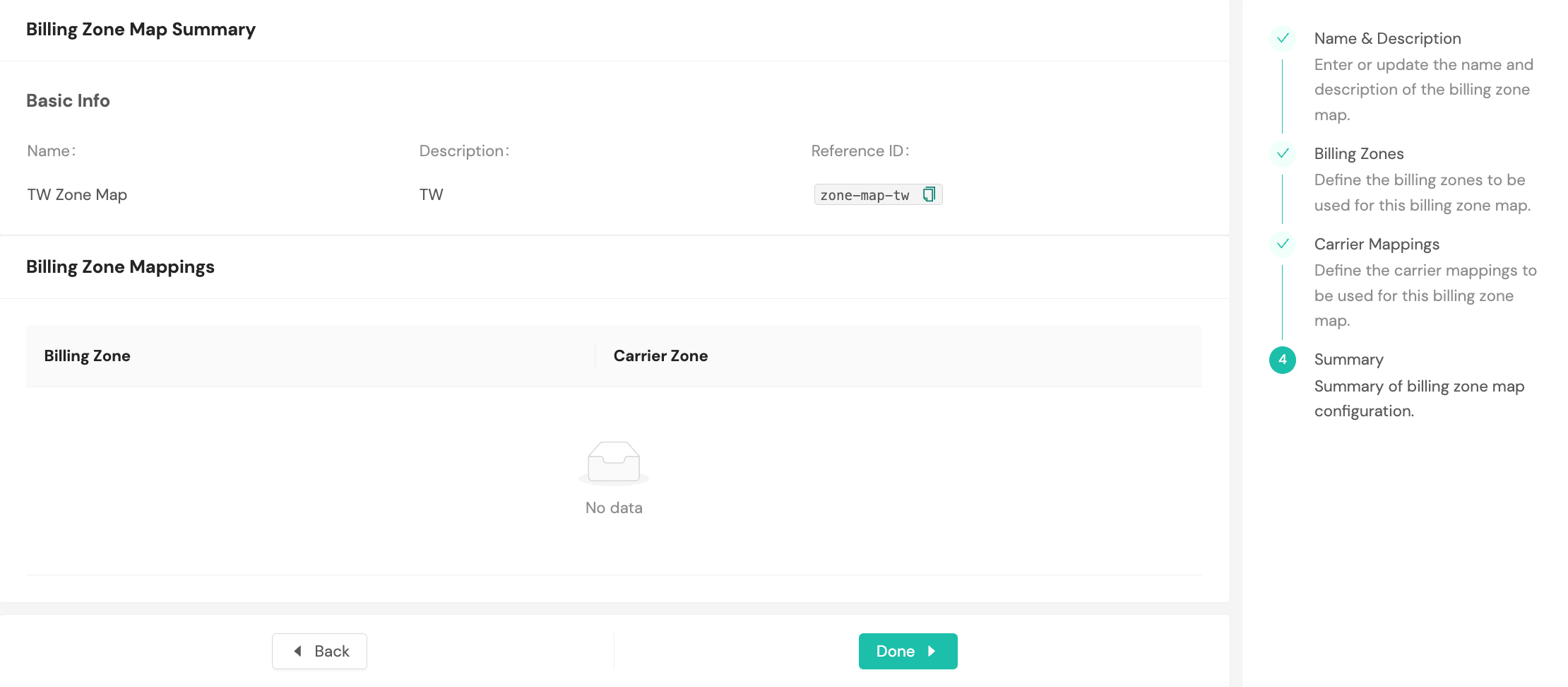 - Billing Zone Map. The zone mapping configuration (if applicable).