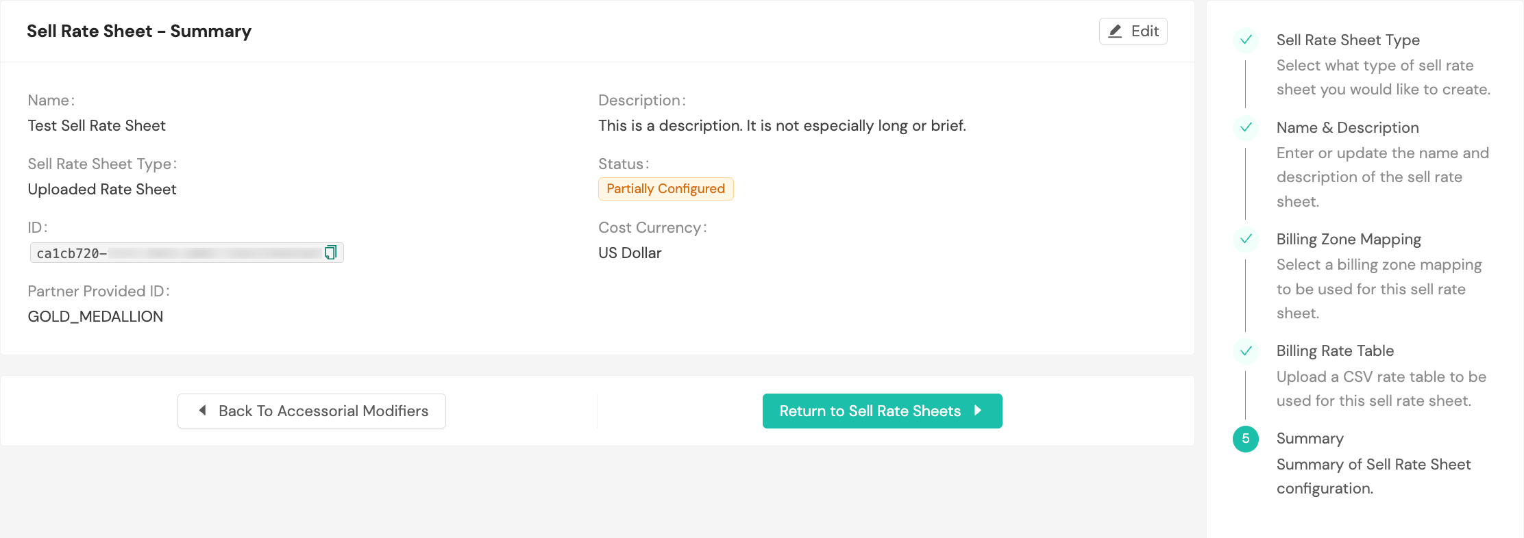 To resume configuring a partially configured ratesheet, select it from the list and complete the remaining steps.