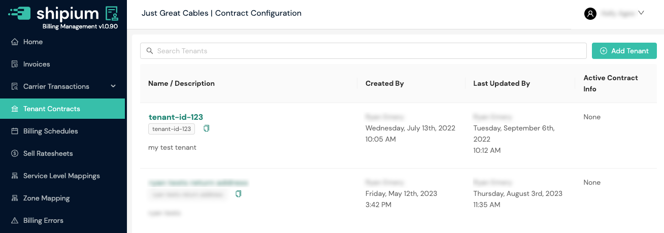 - Tenant view is for organizations (such as 3PLs) that manage billing across multiple tenants (customers). You'll see tenant-specific billing data and configuration options for managing individual customer relationships, including tenant contracts, sell ratesheets, and tenant attribution.