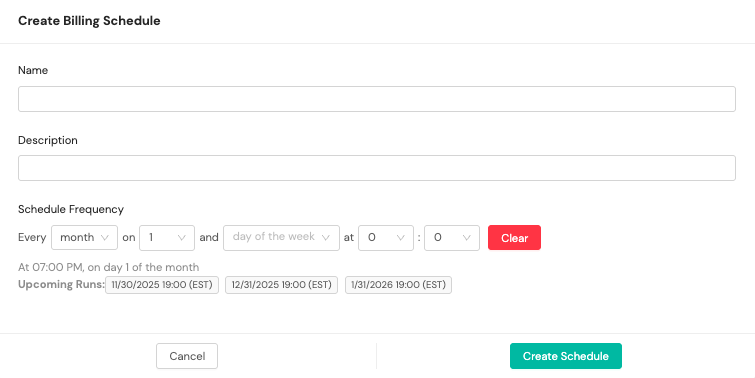 If you selected + Add Billing Schedule, you'll be prompted to provide a name, description, and schedule frequency. The schedule frequency builder allows you to define when invoices should be generated using dropdown selectors.