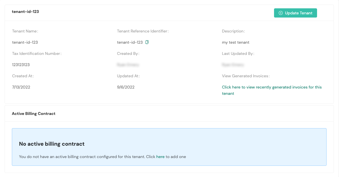 You can select any existing tenant to access its details screen, which provides the opportunity to edit tenant details by selecting + Update Tenant.