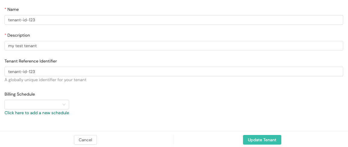 Selecting + Update Tenant prompts you to provide new information for any desired fields for the tenant you've selected.