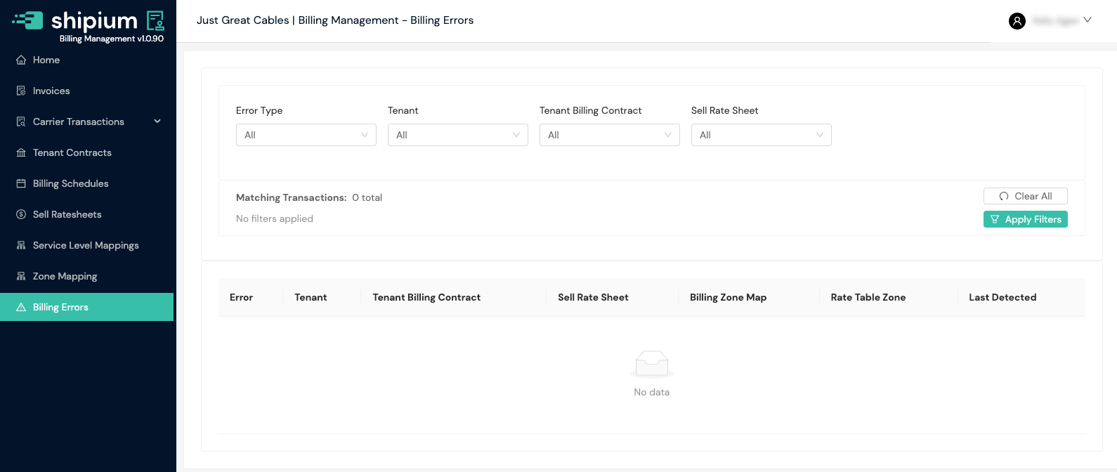 You can filter billing errors by error type, tenant, tenant billing contract, and sell ratesheet.