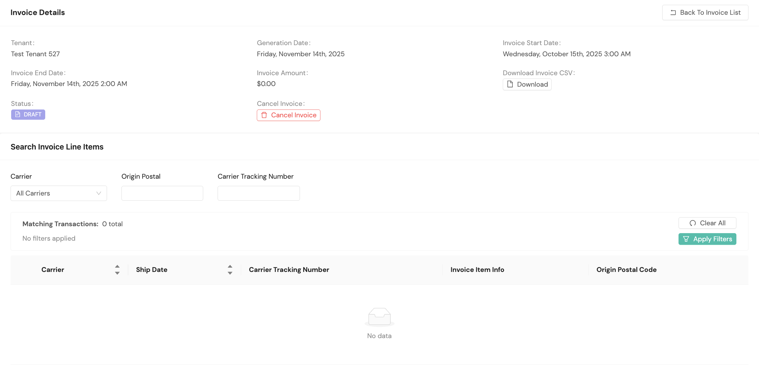 - Carrier Transactions. Search and manage carrier transaction records, with the ability to filter by tenant.
