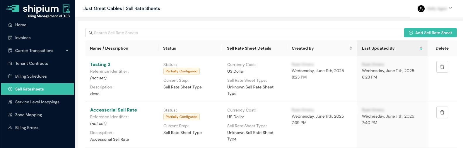 Sell ratesheets require multiple configuration steps. The list view displays each ratesheet's current status: