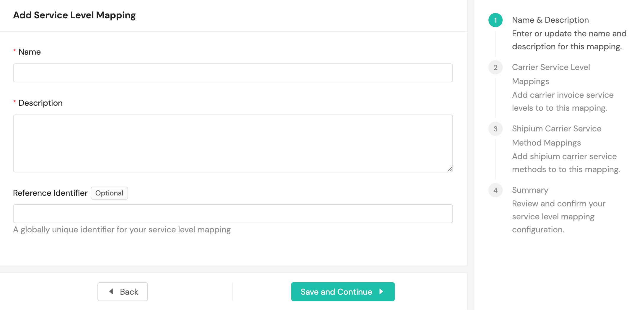 To add a new carrier service level mapping to your settings, you'll provide a name and description. Optionally, you can provide a reference identifier.