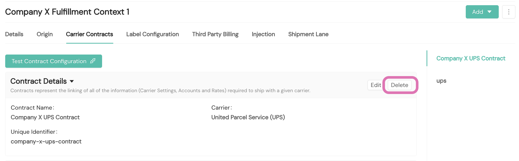 For more permanent changes to carrier availability, you can remove a carrier contract from a fulfillment context entirely. This prevents the carrier from being selected for any shipments using that fulfillment context.
