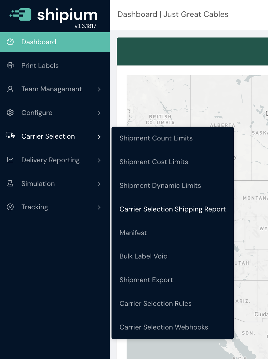 In the Shipium Console, you'll navigate to Carrier Selection and then Carrier Selection Shipping Report. The report is available to users with appropriate permissions to view carrier selection data.