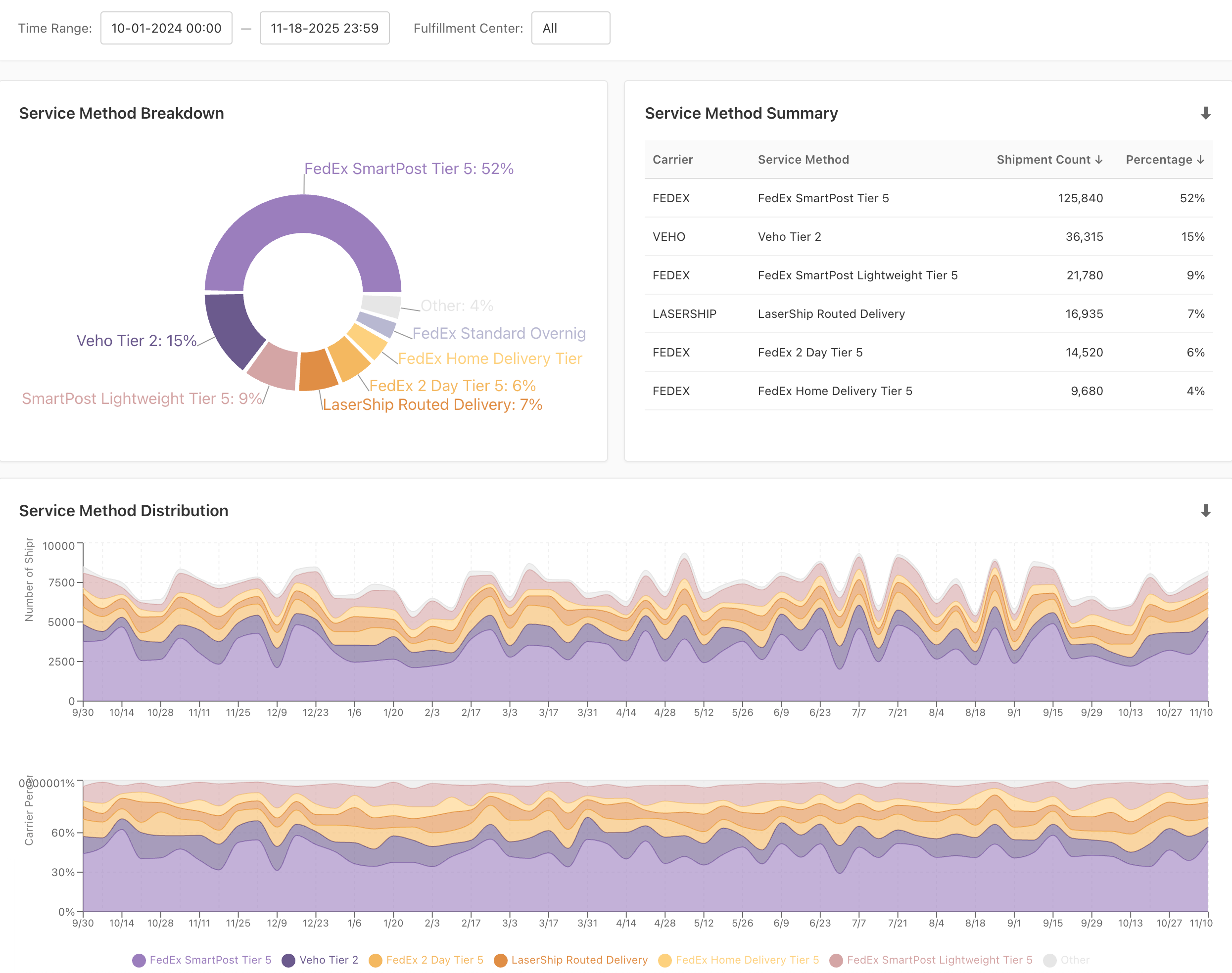 Percentage mix over time. The lower chart displays the percentage breakdown of service methods on each day. This normalized view helps you understand changes in your carrier mix regardless of overall volume fluctuations.