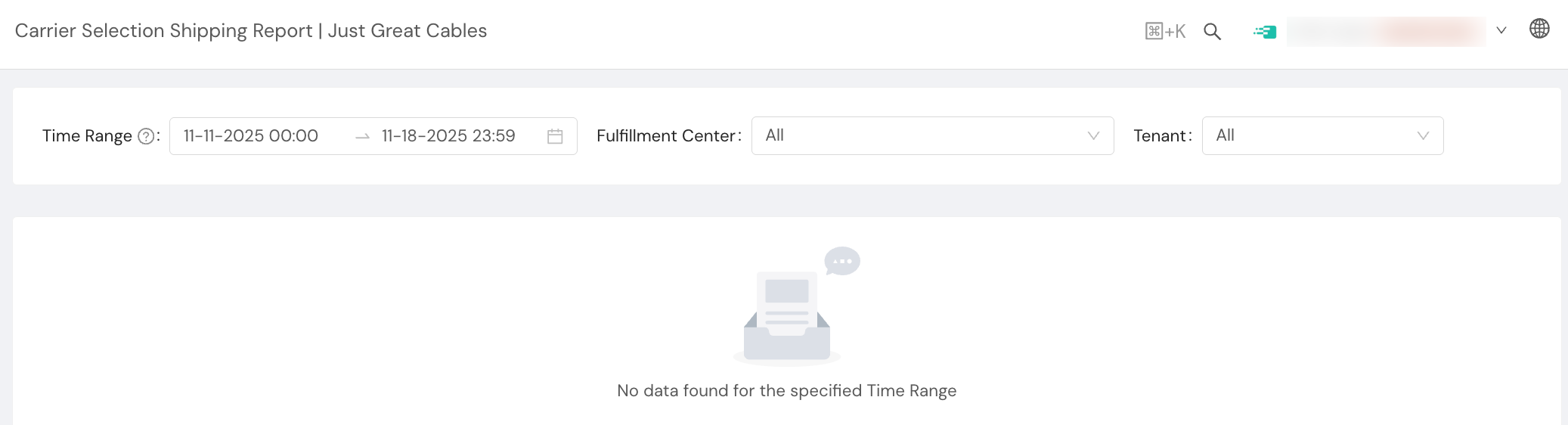 You will use the date picker to specify the Time Range for your analysis. The report displays data for all shipments that completed carrier selection during the selected period. In addition, you can select a specific Fulfillment Center to view carrier selection data for that location, or choose "All" to see aggregated data across all your fulfillment centers. Similarly, you can select a specific Tenant or choose all tenants.