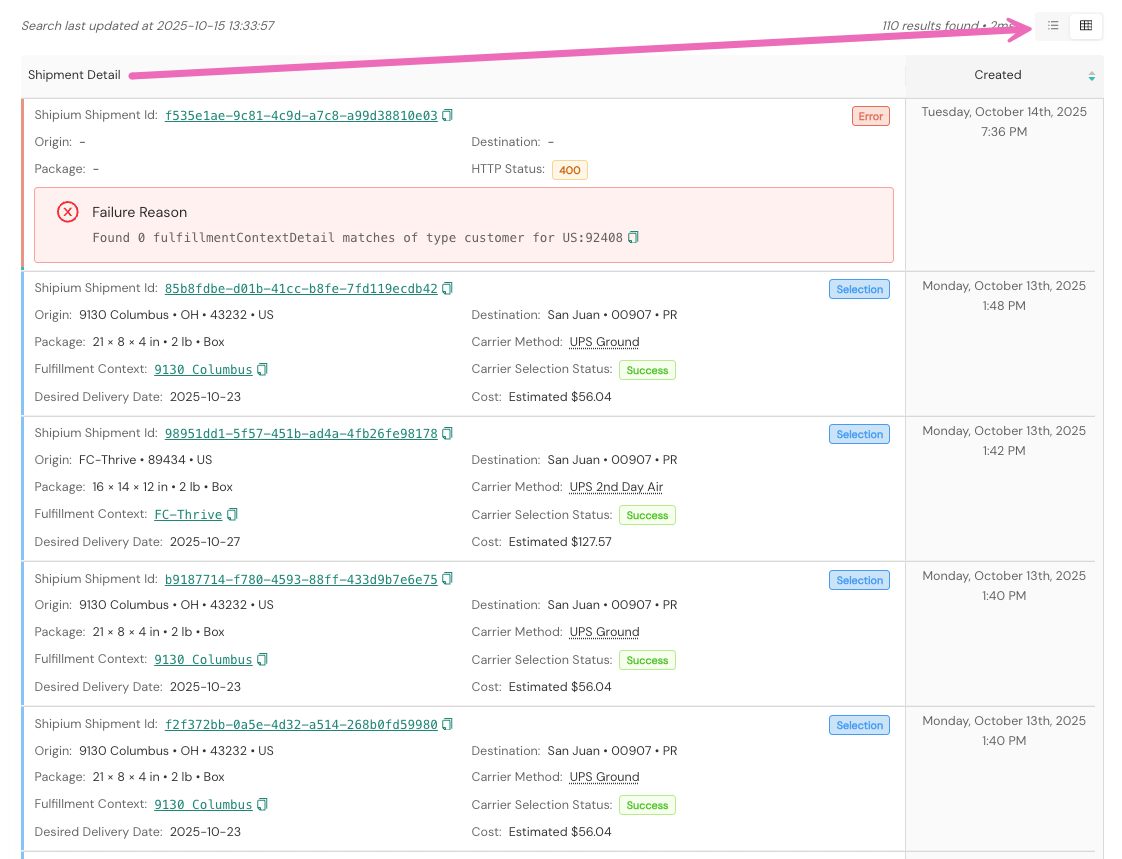 You can determine the level of detail returned in your search results list by selecting either the list icon or the card icon at the top right of your search results. The list view abbreviates shipment details, while the card view provides greater detail, as shown in the following card view screenshot. Clicking on any shipment ID will take you to a details screen for the shipment, where you'll see the results that are defined in the following sections.