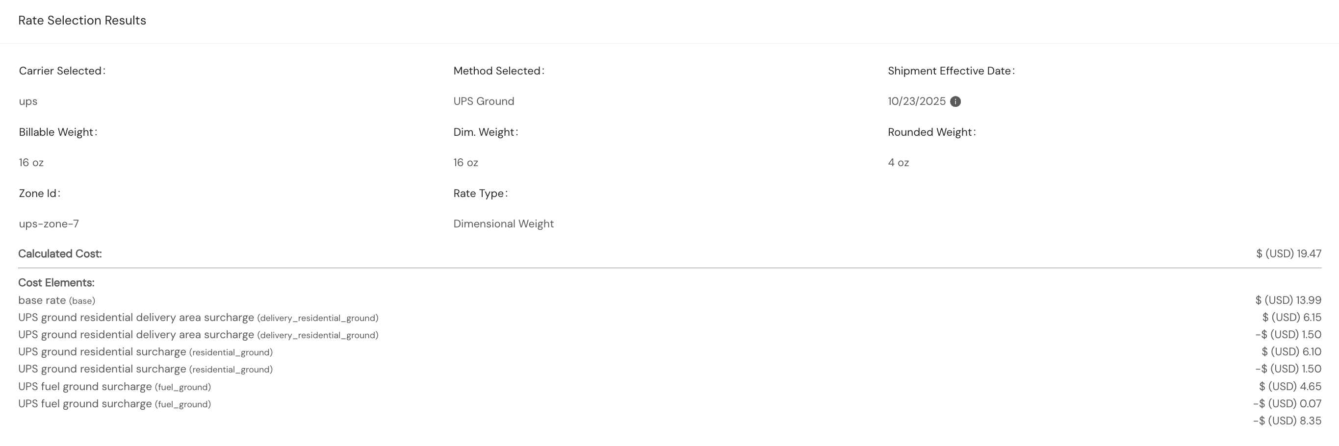The Rate Selection Results section includes the carrier and service method selected for the shipment, the shipment effective date, shipment weights, a delivery zone identifier, a Shipium modeled total calculated cost, and a breakdown of cost elements.