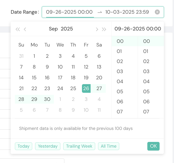 For the date range, you can select specific start and end dates or choose from the Today, Yesterday, Trailing Week, or All Time ranges.