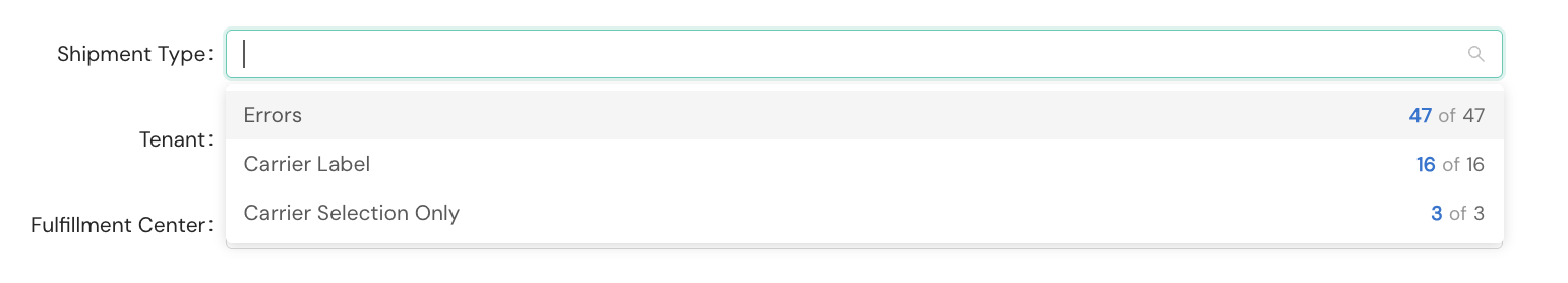 - Shipment Type. Th shipment type filter allows you to filter shipments by the service that was used to create them: carrier selection, label creation, or both.