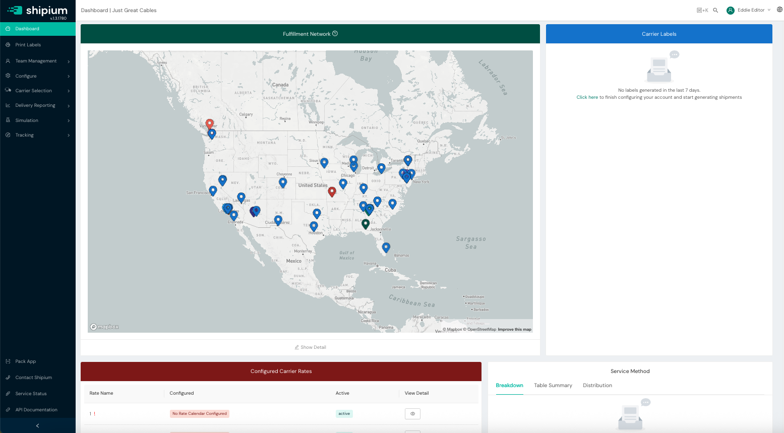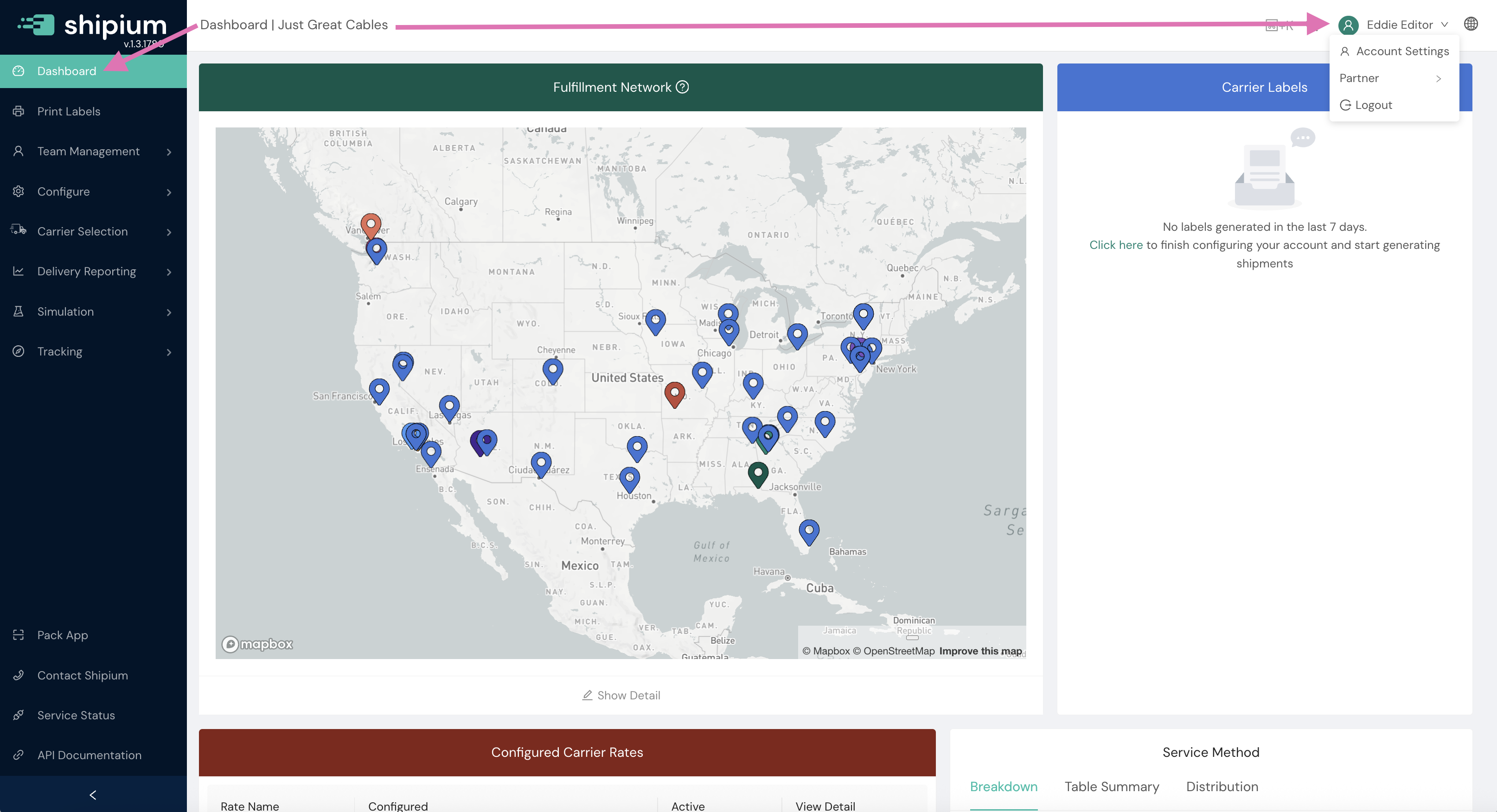 The basic layout of the console includes a lefthand navigation menu and an account widget at the top right of the page. The navigation menu contains links for label printing, team management, and configuration in addition to specific settings for carrier selection, delivery reporting, and tracking. The account widget is where you can access account settings and log out of the application. You also can switch between accounts if applicable to your organization. In addition, you can check Shipium's platform service status and access the API documentation from the navigation menu.