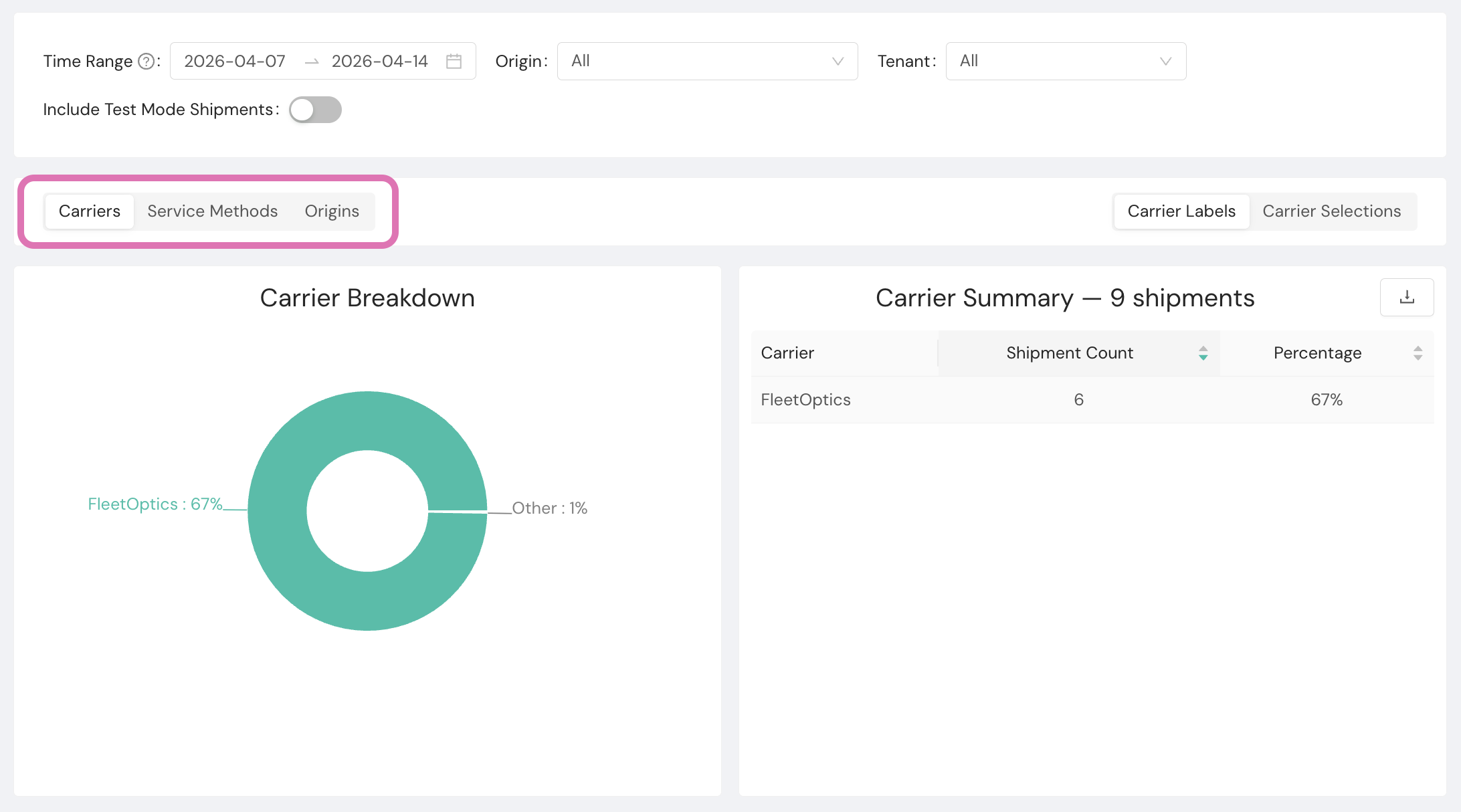 - Carriers. View shipment distribution by carrier.