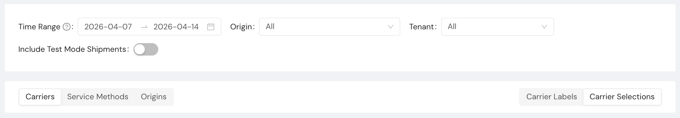 - Include Test Mode Shipments. Toggle on to include shipments created in test mode. Test mode shipments are excluded by default.