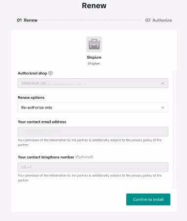 Step 1 — Renew: Confirm your authorized TikTok shop. Under Renew options, select the duration you want to apply. To avoid future re-authorization, select Update to unlimited. Enter your contact email address and select Confirm to install.