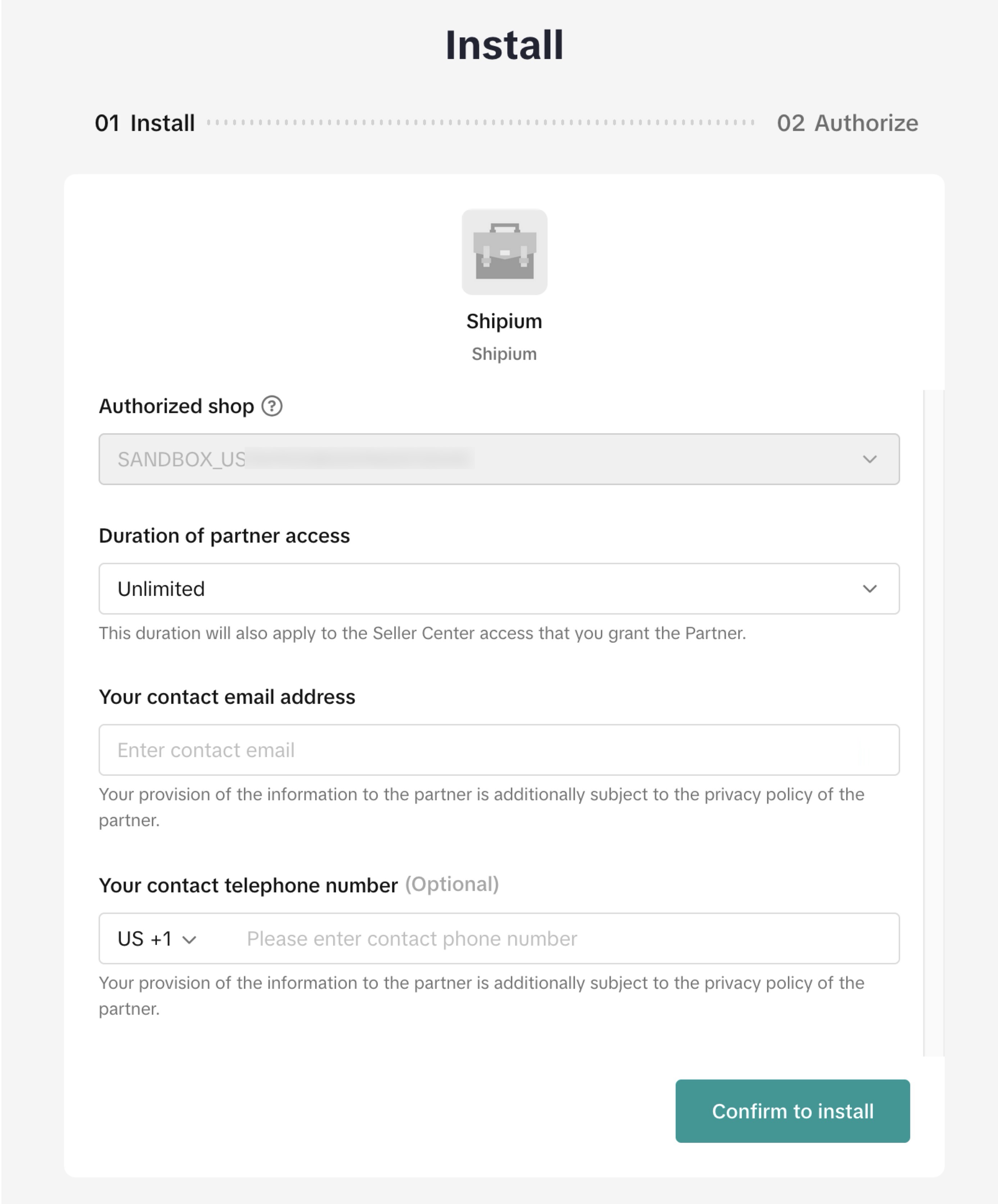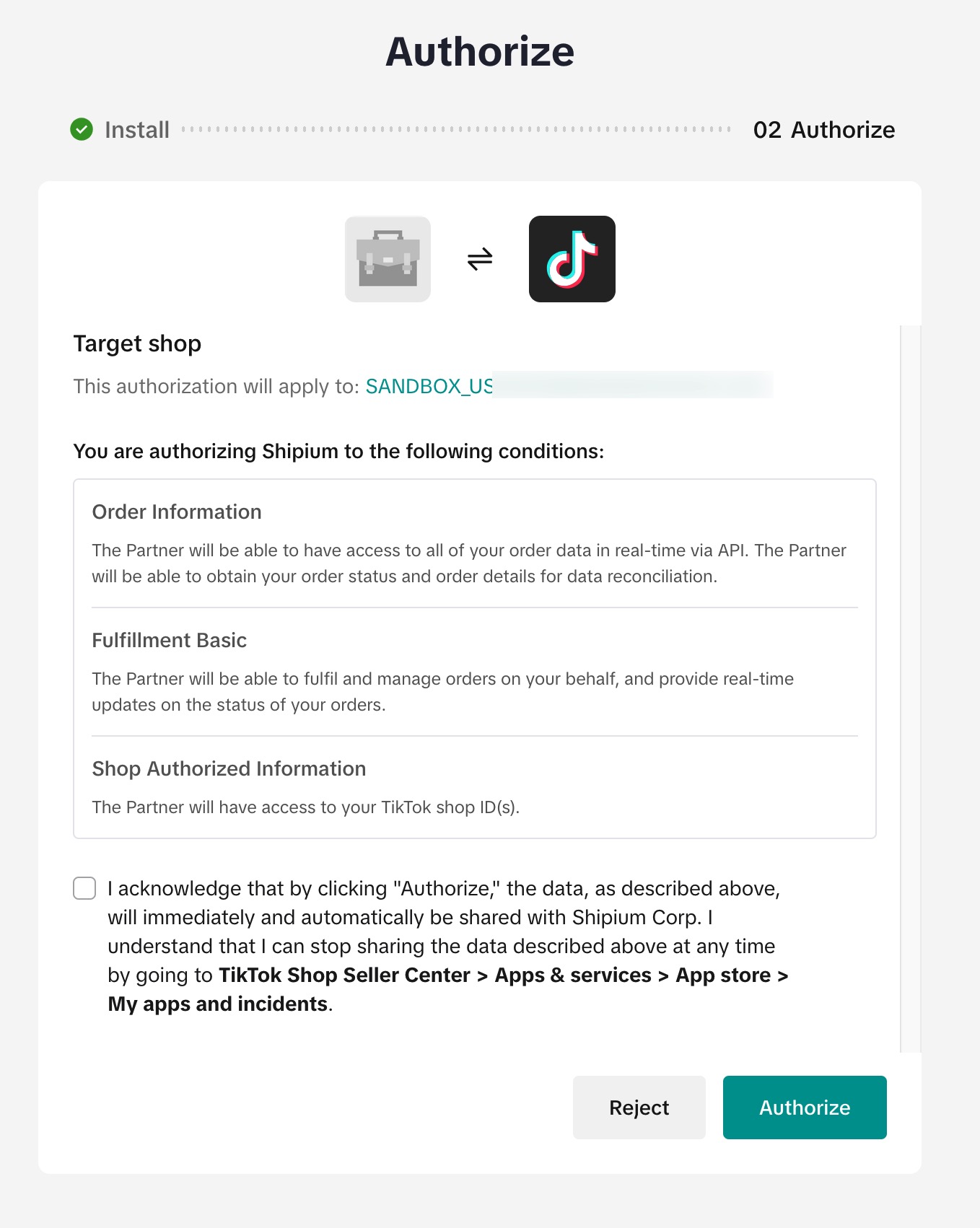 When you open the registration link, you'll be taken through a two-step authorization flow in TikTok Shop.