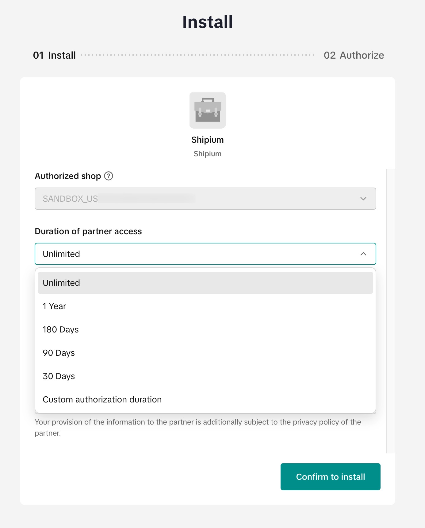 On the Authorize screen, review the permissions Shipium is requesting for your shop, then check the acknowledgment box.