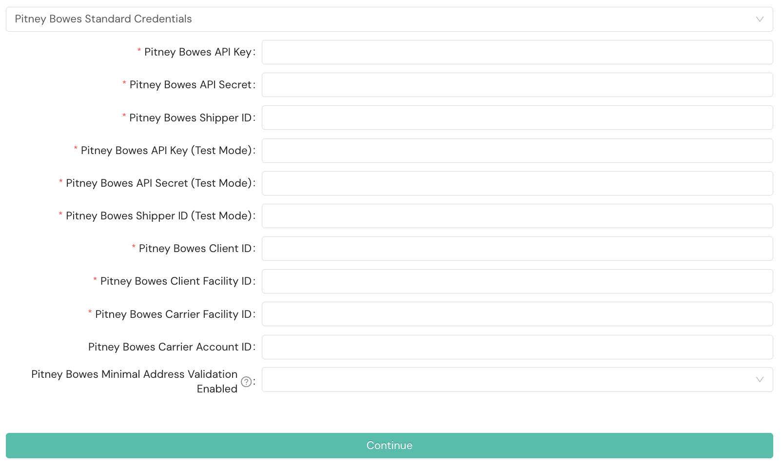 Select Pitney Bowes Standard Credentials from the dropdown menu if you're using Pitney Bowes Expedited service methods. All fields are required unless noted as optional.