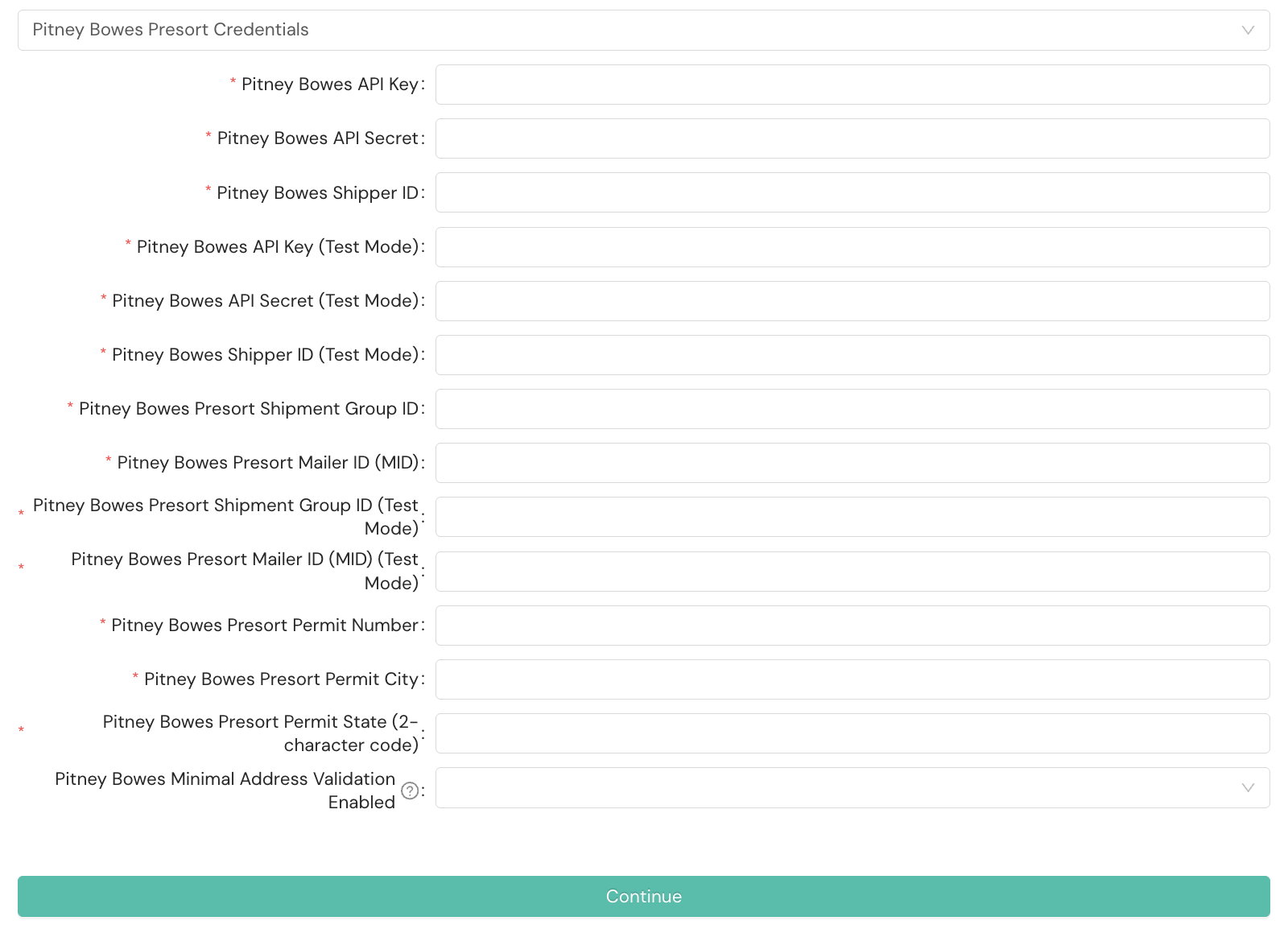 Select Pitney Bowes Presort Credentials from the dropdown menu if you're using Pitney Bowes Presort service methods for flats or marketing mail. All fields are required unless noted as optional.